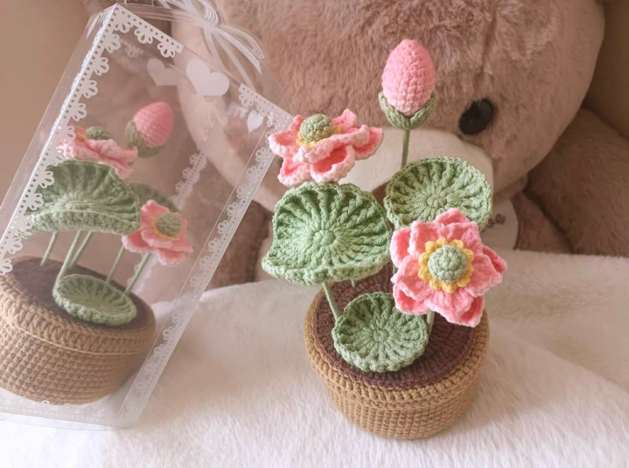 Crochet Lotus Flower with Crochet Pot(Small:12~15 cm/4.7~5.9 inch,Medium:18~20 cm/7~7.9 inch)